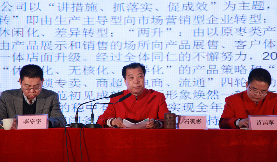 3月7日至10日,以“緊盯戰略、深化轉型、責任成果、落實到位”為主題的 好想你2014年度工作總結暨2015年度戰略部署大會在公司中華棗文化博物館三樓舉行。公司董事長石聚彬,總經理苗國軍、特勞特高 級分析師侯德夫、董事、監事、各中心總經理、全國各省區銷售經理、各經銷商、各行管部門經理級別及以上人員參會,會議由企管 部總監孫嘯主持。