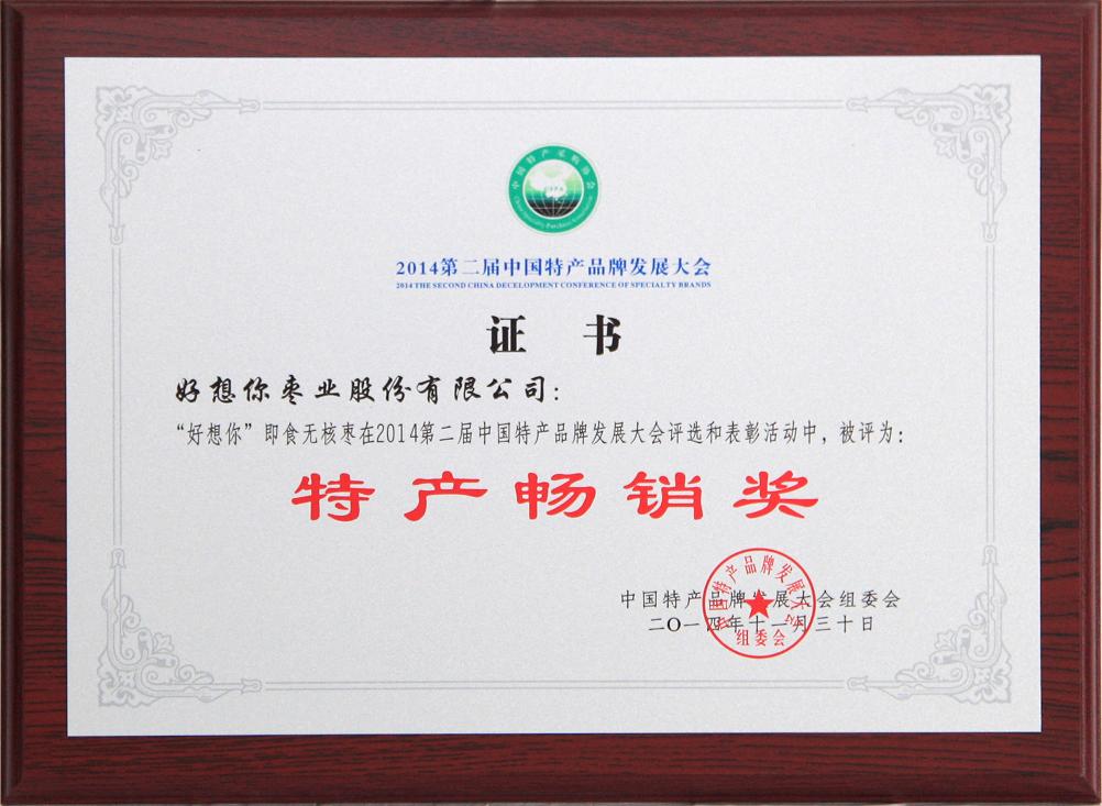由中國特產采購協會、中國藥文化研究會、中國營銷協會、中國農業科學院農業傳媒與傳播研究中心、中國縣域經濟報社聯合主辦的“2014第二屆中國特產品牌發展大會”于2014年11月30日在北京民族飯店召開,知名產業專家、相關部委領導、電子商務領導、金融資本領導、特產企業領導和媒體代表約300余人參加。本次大會以“創新營銷思路、分享品牌智慧”為主題,好想你即食無核棗獲特產暢銷獎。